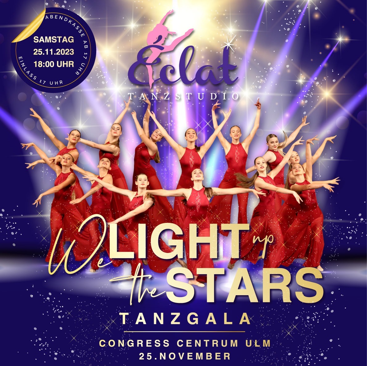 Das Tanzstudio Eclat zeigt ihren Zuschauern, wie kreativ und vielseitig Tanzen sein kann. Eine fantastische Mischung unterschiedlicher Tanzstile, dargeboten in anspruchsvollen Choreografien. Ob Klassisches Ballett, Modern Dance, Showdance oder Zumba: über 200 Tänzer des Tanzstudios Éclat im Alter von 5 Jahren bis zu Erwachsenen Alter freuen sich ihr Können auf der professionellen Bühne zu präsentieren und das Publikum zu begeistern. Eintrittspreise:
